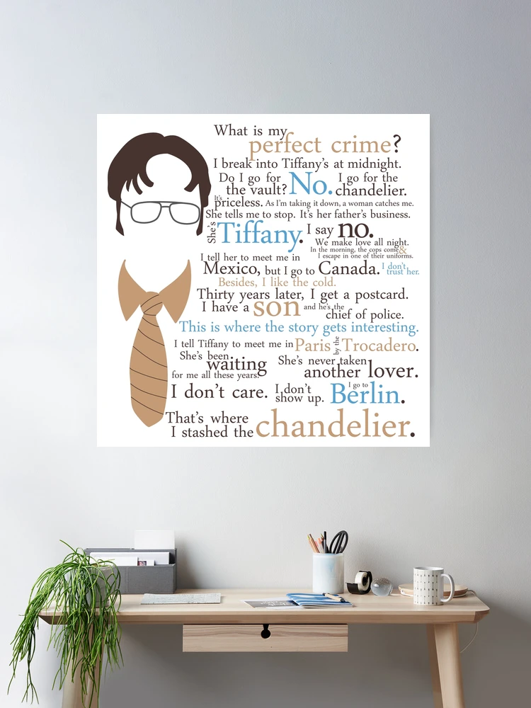 The Office Dwight Tiffany’S Quote Dwight Schrute the Office Wall Art Perfect Crime Funny Wall Art : Palestinian national poet Mahmoud Darwish’s works are seeped in the sights and sounds and sorrows of his beloved homeland. Author, scholar and thinker Hussein Barghouthi, diagnosed with lymphoma . Looking back at the year in pop culture, few TV moments were as thrilling and shocking as Tiffany “New York” Pollard’s scathing monologue delivered to Omarosa Manigault Newman on an episode .